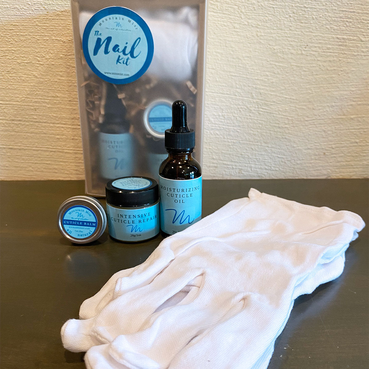 Deeply moisturize and treat your hands and nails with our overnight Nail Slugging Kit! This amazing kit includes a 1 ounce bottle of our rich and nourishing cuticle oil, 1 ounce pot of deeply moisturizing Intensive Cuticle Repair, .25 ounce tin of our ultra-soothing Cuticle Balm, and 2 pairs of cotton gloves to allow the products to work their magic as you sleep. Packaged beautifully in a bag with an instruction tag.