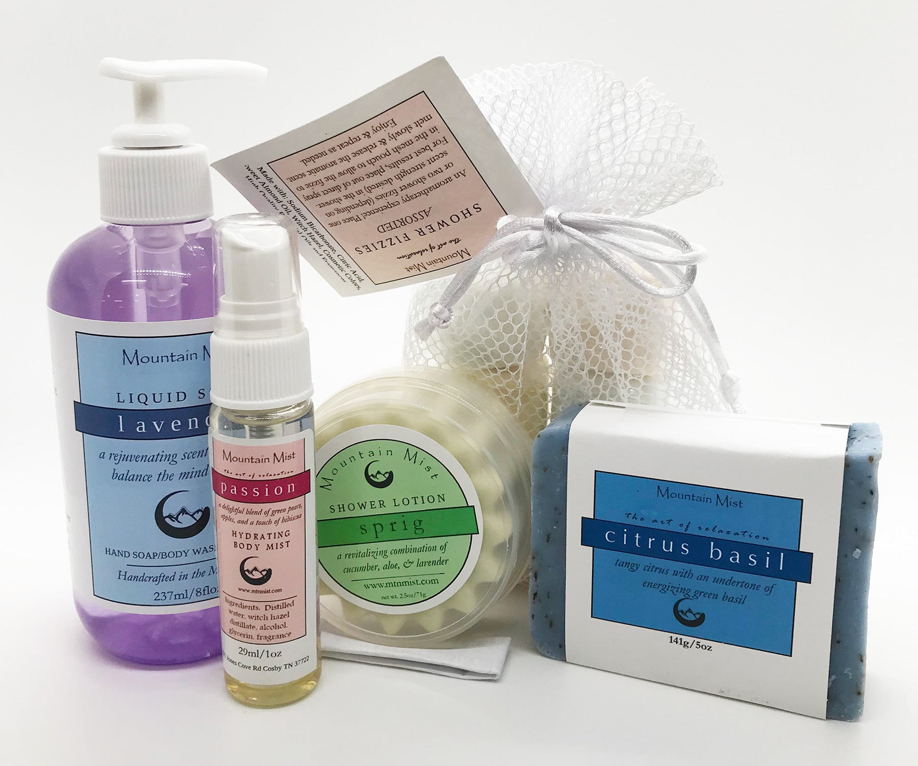 Our 6-pack of Assorted or Sinus Relief Shower Fizzies, Liquid Soap, Shea Soap, a mini Hydrating Body Mist and one of our amazing Shower Lotions in any scent combination you desire make this a complete a set for cleansing, moisturizing, scenting, and revitalizing.